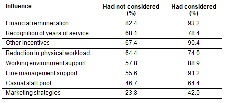 To explore the nature of prospective post-retirement work arrangements, respondents were presented with eight potential facilitators for post-retirement engagement. These included support and understanding from line management, understanding from the work environment, recognition of their years of service, financial remuneration, the reduction of physical workloads, the availability of a casual pool bank for older staff, marketing strategies (such as a retired nurses network) and or other incentives (such as the availability of staff accommodation, or airfares).