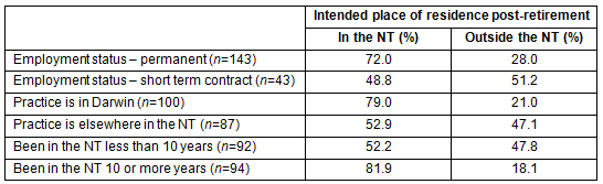 Three variables were found to be significant for respondent's intentions to remain living in the NT past their official retirement. These included respondent's employment status, urban versus remote places of practice, and the time respondents had been continuously living in the NT. Table 4 compares employment status and intentions to live in the NT post-retirement. Permanent employees were more likely to retire in the NT when compared with contract workers. While 72.0% of permanent employees intended to remain living in the NT post-retirement, 48.8% of contract workers intended to stay. Other significant factors for intending to remain in the NT included Urban vs. Remote areas of practice.