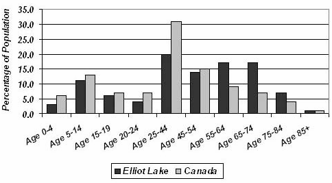 Figure 1: Comparison of population age cohorts between Elliot Lake and Canada (source: Statistics Canada).