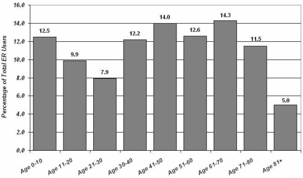 When considering the population of Elliot Lake, there is no specific demographic cohort that uses the ER anomalously. Groups are represented roughly proportional to their catchment area population. This is significant, considering the high proportion of elderly people in Elliot Lake, and because the community continues to actively recruit retirees to maintain economic stability. The median age reported among Ontarians by Statistics Canada is 37.2 years30. Elliot Lake has a median age of 49.4 years and a very high percentage of persons aged 65-74 years (25%) compared with the Canadian average (12%)30. The finding that elderly persons in Elliot Lake generally do not misuse the ER more than other age cohorts agrees with another Canadian study by Eagle et al.9. Also, in a previous study of physician visits by elders in Elliot Lake31, there was no clear trend on the mean number of visits with increasing age.