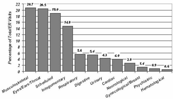 The presenting reasons for using the ER were grouped systemically and are summarized (Fig 3). There were 1126 listed reasons for visiting the ER within the interviewed sample, which is more than the number of interviewed clients (1096), because some clients presented more than one condition. Musculoskeletal conditions such as lower back pain, shoulder pain, fractures, and sprains accounted for 233/1126 of the reasons for using the ER (20.7%, 95% CI 19.6%-21.8%). Problems with the eyes, ears, and throat represented 231/1126 of the reasons for using the ER (20.5%, 95% CI 19.4%-21.6%). Scheduled visits to consult with the family physician on duty at the ER (most of them non-urgent/non-emergency) constituted 214/1126 of the reasons for clients to use the ER (19.0%, 95% CI 17.9%-20.1%). These scheduled visits were for conditions that could have been managed in the family physician's office, rather than for conditions requiring specialized emergency facilities and staff.