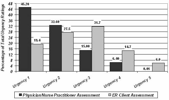 Figure 4: Comparison between physician/nurse practitioner and client perceived urgency of cases presented to Elliot Lake ER.