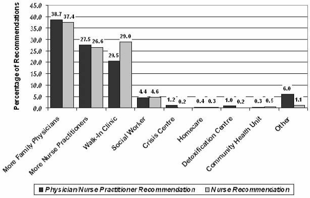 The recommendations by health professionals to alleviate the caseload of the Elliot Lake ER are summarized (Fig 5). The recommendations were made for each of the reasons for visiting the ER, and some clients had more than one reason. Physicians/nurse practitioner made recommendations for 1147 of the reasons, and nurses for 1498 of reasons. Physicians/nurse practitioner believed that the recruitment of additional family practitioners would reduce ER use for 444/1147 of the reasons (38.7%, 95% CI 37.4%-40.0%). They also recommended as an alternative the recruitment of nurse practitioners for an additional 315/1147 of the reasons (27.5% 95% C.I 26.3%-28.7%). Similarly, nurses suggested the recruitment of family practitioners for 560/1498 of the reasons (37.4%, 95% CI 36.5%-38.3%), and the recruitment of nurse practitioners for 398/1498 of the reasons (26.6%, 95% CI 25.8%-27.4%). Physicians/nurse practitioner considered that 235/1147 of the reasons for using the ER (20.5%, 95% CI 19.4%-21.6%) could have been handled by a walk-in clinic, if available (as of 2003 there is still no walk-in clinic in Elliot Lake). Nurses suggested the hypothetical use of a walk-in clinic for 435/1498 of the reasons (29.0%, 95% CI 28.2%-29.8%). The 'other' category includes all suggestions considered impractical or impossible to implement in Elliot Lake.