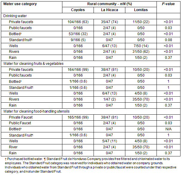 The use of private faucets (p<0.01), public faucets (p=0.03), wells (p<0.01), and rivers (p<0.01) as sources in the water-use categories of drinking water, and water for cleaning fruits, vegetables, and food-handling utensils were significantly different across the three communities (Table 1). For all the water-use categories, private faucets were used most commonly in Coyoles and La Hicaca, while rivers were used most commonly in Lomitas. The use of purchased bottled water as a source of water for drinking was statistically significant (p<0.01) across the three communities, used most commonly in Coyoles (53/166, 32%), but not used in Lomitas (0). Only participants in Coyoles identified Standard Fruit as a water source, where it was used mostly as a source of drinking water (9/166, 5%) (p=0.08).