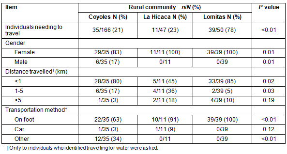 The number and gender of individuals traveling in order to obtain water, the distance traveled, and the method of water transportation among the three communities are summarized (Table 2). Thirty-two percent (85/263) of all respondents identified having to travel to obtain water. Of these, 80% (28/35) in Coyoles, 45% (5/11) in La Hicaca, and 85% (33/39) in Lomitas identified traveling less than 1 km (p<0.02). Females were most commonly responsible for acquiring the water in Coyoles (29/35, 83%), and were the exclusive collectors of water in La Hicaca (11/11, 100%) and Lomitas (39/39,100%) (p<0.01). Travel by foot was the most common transportation method (p<0.01) in all communities.
