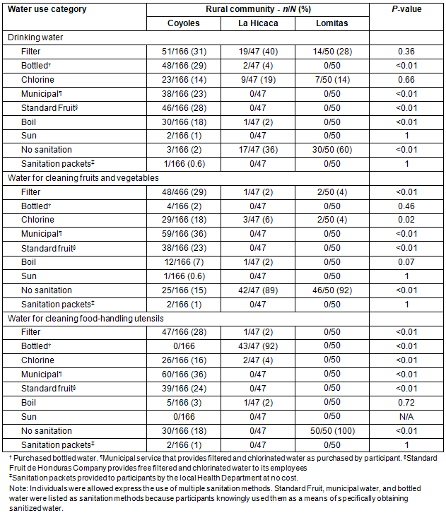 The methods used to sanitize water for the water-use categories of drinking water, and water for cleaning fruits, vegetables, and food-handling utensils in Coyoles, La Hicaca, and Lomitas are summarized (Table 3). Only in Coyoles was water from Standard Fruit and a municipal water service available as methods of acquiring sanitized water. The use of no sanitation method for any of the water-use categories was statistically different across the three communities (p<0.01), and most common in Lomitas. The use of bottled water as a method of using sanitized water for drinking was most common in Coyoles (48/166, 29%), not used in Lomitas (0/50, 0%), and significantly different (p<0.01) across the three communities. The use of filters and chlorine as methods to sanitize water for cleaning fruits, vegetables, and food-handling utensils was significantly different across the three communities and used most commonly in Coyoles.