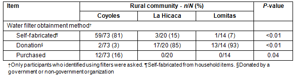 Self-fabricated filters (p<0.01) were used most commonly (59/73, 81%) in Coyoles, and filters donated by governmental and non-governmental organizations (NGOs) (p<0.01) were most commonly used in La Hicaca (17/20, 85%) and Lomitas (13/14, 93%) (p<0.01) (Table 4). In all three communities chlorine was purchased (59/59, 100%), and obtained only in liquid form (59/59, 100%).