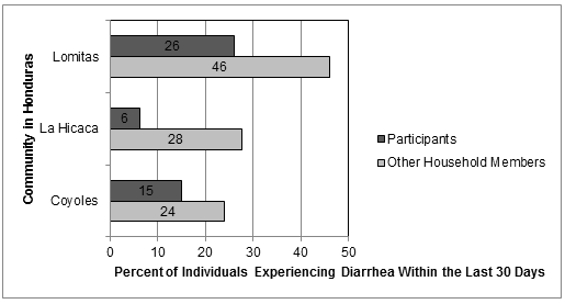 Although increases in access to oral rehydration therapy have improved in Honduras, diarrheal illness continues to be a concern11. In a study by Fischer Walker et al published in 2012, the incidence of diarrheal illness in Honduras for children under five years of age was estimated at 18.6 episodes per child year12. WHO data for children under 5 years of age from 2004 indicated that poor water and sanitation contributed to a death rate of 106 per 100 000 capita and 3862 disability adjusted life years per 100 000 capita13. Updated data on diarrheal illness in rural areas is lacking.