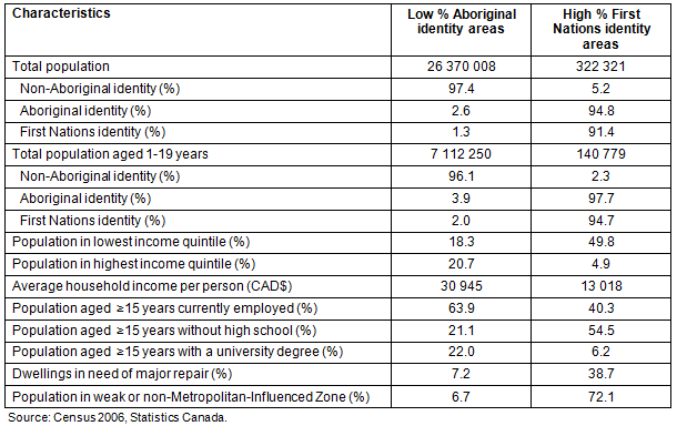 There were several significant socioeconomic and demographic differences between high-percentage First Nations identity areas and low-percentage Aboriginal identity areas. The population age-structure varied significantly between areas, with 27% of the population in low-percentage Aboriginal identity areas aged 1-19 years, compared with 43.7% in high-percentage First Nations identity areas, 94.7% of whom were of First Nations identity. The majority of the population in high-percentage First Nations identity areas (72%) lived in rural areas (weak or non-Metropolitan influenced zones). The percentage of population in either the lowest or highest income quintile varied considerably, reflected also in the difference between average household income per person. In low-percentage Aboriginal identity areas, 21.1% of the population was without a secondary certificate compared with 54.5% in high-percentage First Nations identity areas. There was also a large difference in the percentage of dwellings in need of major repair, with 7.2% of people in low-percentage Aboriginal identity areas living in dwellings in need of major repair compared with 38.7% in high-percentage First Nations identity areas.