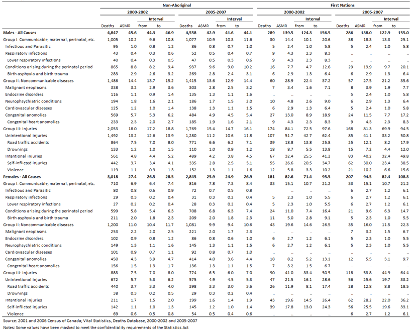 identity areas and low-percentage Aboriginal identity areas, Canada, 2000-2002 and 2005-2007, by cause