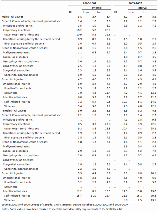 Rate ratios of the ASMR between low percent Aboriginal and high-percentage First Nations identity areas further highlight the calculated mortality differentials. Overall, rate ratios for males were 3.1 for 2000-2002 and 3.2 for 2005-2007 and for females were 3.0 for 2000-2002 and 3.6 for 2005-2007. Grouped according to WHO Global Burden of Disease classification24, within Group I - infectious and parasitic diseases, the largest differences were for respiratory infections, particularly lower respiratory infections. For Group II causes - non-communicable diseases, the rate ratios were not as great, with congenital anomalies for males and endocrine disorders for females showing the largest rate ratios for 2005-2007.