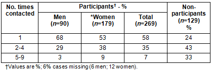 If initial contact was made in a telephone call, the RA mainly arranged a time, mode of interview, and date that would be most convenient for the participant to complete the survey. Over half of the participants completed the survey by telephone on the first phone call, with a number of follow-up calls made in an attempt to contact all who expressed initial interest (Table 1). Over two-thirds of participating men completed the survey after initial contact. Participation rates by both men and women substantially decreased after four contact attempts.