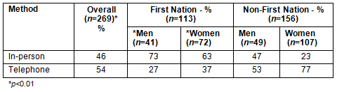 Approximately two-thirds of FN participants were women (63%) and over two-thirds of non-FN participants were women (68%). Significantly more participants (54%) opted to complete the survey by telephone (p<0.01; Table 2). In the whole sample, more men (59%) and fewer women (27%) completed the survey in person (p<0.05). More FN men and women completed surveys in person rather than completing the survey by telephone. Even after controlling for sex, education, employment status, age and health status, FN respondents were less likely to complete the survey by telephone compared with non-FN respondents (odds ratio=3.45, 95% confidence interval: 1.79-6.67), perhaps reflecting limited local access to phones.