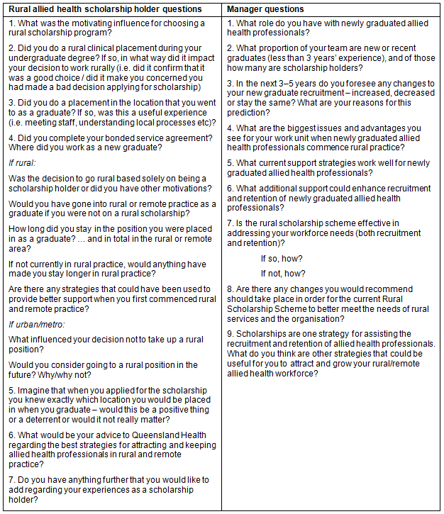 Managers of rural allied health scholarship holders: Managers were identified by AHWACU if they were in an allied health leadership role responsible for a rural or remote workforce (the target of the QHRSS-AH). This included services that commonly took scholarship holders and those that rarely did. Fifteen managers were identified and contacted by AHWACU. The process of information provision and contact was as per the scholarship holder group previously described.