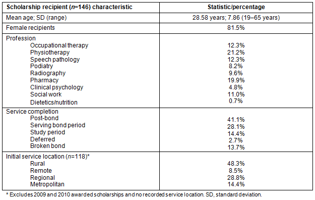 Service location of scholarship holders: Of the scholarship holders who had entered their service period, the location of initial service was 48.3% rural, 8.5% remote, 28.8% regional and 14.4% metropolitan. For this study 'rural' and 'remote' were defined consistent with the Queensland Health human resources framework, 'metropolitan' as within 150 km of Brisbane and 'regional' as all other centres11. The scholarship recipient characteristics are presented in Table 2.
