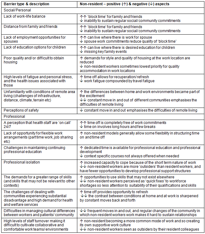 Table 2: Positive & negative aspects to non-resident work, according to barriers to recruitment and retention of remote area health professionals