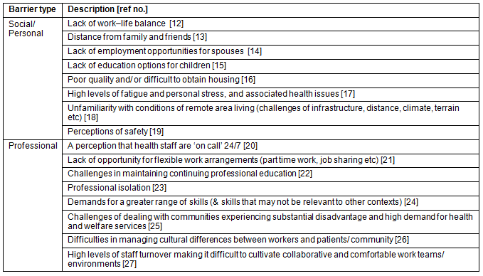 Table 1: Established barriers to recruitment and retention of remote area health professionals12-27