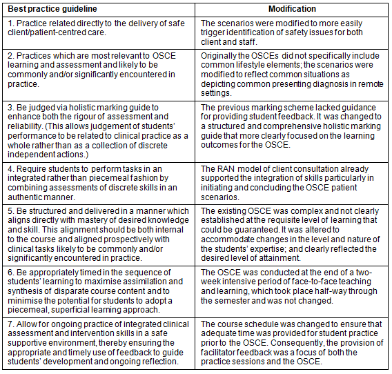 In previous years, OSCEs were conducted. These OSCEs were modified from previous iterations according to the BPGs11. A pre-implementation visit was conducted by two of the project team, who worked with the site academic staff to consider how the current OSCEs performed against the BPGs. Table 1 illustrates the modifications that occurred in relation to the seven BPGs following this consultation period.