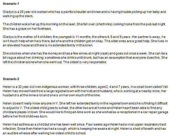 Following the pre-site visit, two scenarios were developed based on the BPGs. Students were required to conduct an assessment of one of the two 'clients' using the RAN model of consultation. This was conducted on a simulated client who was an actor who was well briefed on the scenario and their role. Each scenario was developed with the requirement for clinical skills in assessment (for example, neurological assessment in Scenario 1 and respiratory assessment in Scenario 2), together with psychological and social assessments. Well-developed interviewing skills, good communication and cultural sensitivity were an expectation of both OSCEs. One hour was allotted for each student's OSCE and feedback was given immediately. This was a formative assessment and no actual mark was given but rather comments were made on what the student did well and areas for improvement. Students were asked to reflect (and share with their tutor) on their own assessment of their 'performance'. The five tutors were all experienced with this form of assessment and were fully briefed about the specific scenarios, new procedures and expectations of student attainment. The two scenarios are summarised in the Appendix.