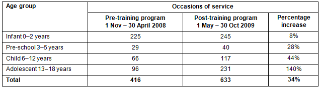 Paediatric physiotherapy outpatient services had increased by 34% after the 6-month training program (Table 1). The criteria for referral to outpatients was limited to single-issue conditions and therefore mostly new referrals. Complex cases, following assessment, were referred to specialist early intervention of disability services unless there was a specific acute case. An example of an acute case was a child requiring rehabilitation following brain tumour surgery whose father would lose his job if they had to stay in the metropolitan service. Noted is the increase in presentations for adolescents (140%) and for children of primary school age (44%).