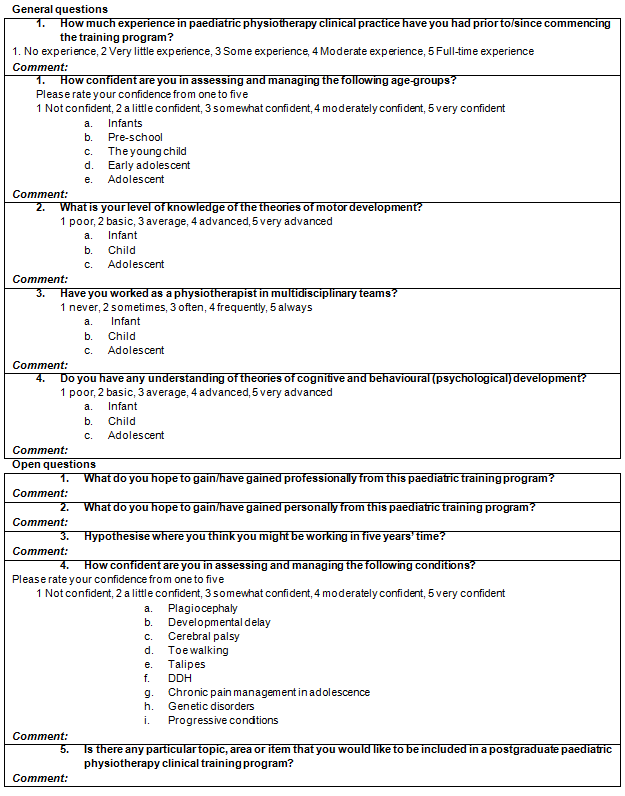Appendix A: 'Building capacity in the rural physiotherapy workforce: a paediatric training partnership': Pre- and post-training program survey