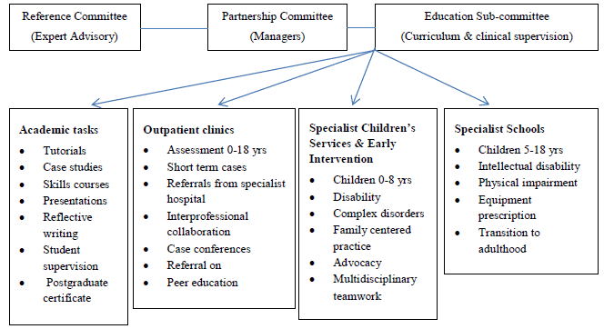 The partnerships developed for the pilot program were consolidated and expanded with regular meetings of the reference group, a partnership committee and an education subcommittee. The reference group comprised a senior hospital administrator and the physiotherapy department head, current and previous directors of physiotherapy at the major metropolitan paediatric hospital, managers of Victorian Early Childhood Intervention Services, a non-government disability services organisation (SCOPE), and two parent consumer representatives. The physiotherapy members volunteered their time. The partnership committee managed the program whilst its education subcommittee guided timetabling and content. It was essential that the project manager was both an academic and a paediatric physiotherapy clinician to develop the timetable, academic content and evaluation.