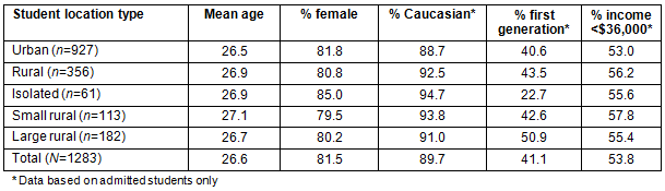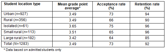 Further research is indicated specifically examining the unique aspects of the rural subgroups, particularly residents at the two ends of the rural continuum (isolated and large rural communities) in terms of achievement and academic needs. A qualitative exploration of applicants' knowledge of and experience with the application process may also aid in better understanding differences in acceptance and retention rates.