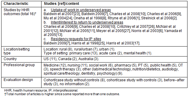 Since this comprehensive search was not specifically directed at IP practice education, it was supplemented with a scoping review of peer-reviewed studies in Medline for January 2004 to August 2012. The search terms comprised synonyms for practice education including clinical, practice or community placements, fieldwork, clerkship and others combined with IP or related terms. HHR-related terms for outcomes included recruitment, interest or intent to practice in underserved communities or related terms. Out of 61 abstracts, three more relevant studies were found2,26,27. While this was not an exhaustive search of all databases, Medline indexes approximately 5600 journals with a strong focus on health administration matching the topic of interest.