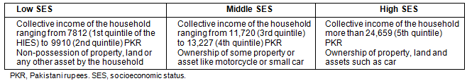 For the purpose of this study, socioeconomic status of each household was categorized as low, middle or high. According to the Household Integrated Economic Survey (HIES) of 2007-089, household income is divided into five quintiles. In this study, first and second quintiles of the HIES 2007-08 were categorized as low, third and fourth quintiles as middle, and fifth quintile as high income (Table 1). Average household size in AJK is approximately 6.7 members8.