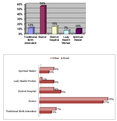 The most preferred healthcare provider of the mothers in both the urban and rural settings of this study was a medical doctor. Some mothers preferred seeking health care from traditional birth attendants and peers sahib. Factors behind such service utilization preferences include crucial shortages of trained health staff at primary care level. As in other provinces of the country the number of LHVs and nurses is not sufficient for the population health needs of the AJK20. The gender of the healthcare provider is a longstanding issue; there are not enough female healthcare practitioners, particularly in rural areas of Pakistan. Since access to the health care of women is defined by societal norms, most of the time it is constrained because of the non-availability of female healthcare providers6.