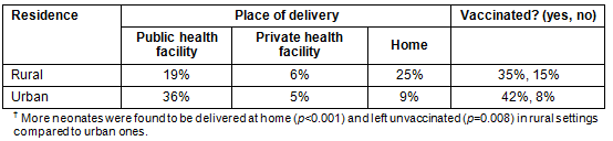 The majority of the neonates (55%) were delivered at the public health facility. The number of deliveries conducted at homewas 34% (Table 2). Elderly experienced ladies attended 53% of deliveries at home; traditional birth attendants were called for 27% of home deliveries. Most neonates (77%) in this study had received vaccination. In cross-table analysis, more neonates were found to be delivered at home (p<0.001) and left unvaccinated (p=0.008) in rural settings compared to urban ones (Table 2).