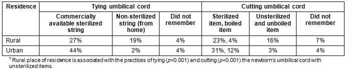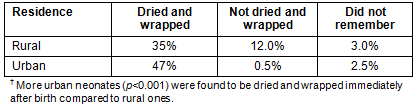 Statistically significant association was found in cross-table analysis between the rural place of residence and the practices of tying (p<0.001) and cutting (p<0.001) a newborn's umbilical cord with unsterilized items (Table 3). Similarly, more urban neonates (p<0.001) were found to be dried and wrapped immediately after birth compared to the rural ones (Table 4).