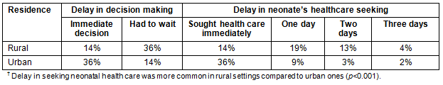 In 50% of cases of sick neonates, healthcare seeking was immediate. Out of the remaining cases, there was delay of 1 day for 28% of sick neonates, a delay of 2 days in 16% and delay of 3 days in 6% of the cases. In cross-tabulation, delay in seeking neonatal health care was more common in rural settings compared to urban ones (p<0.001) (Table 5). The main reason for delay in seeking health care for the neonates was found to be non-availability of transport followed by 'need of permission from elders'.