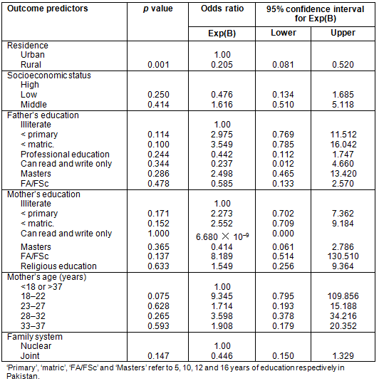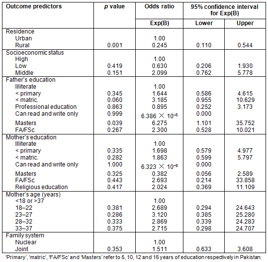Data was collected for variables related to sociodemographic characteristics and household-based practices. Quantitative statistical analysis of variables was carried out using the Statistical Package for the Social Sciences v16.0 (SPSS Inc., http://www.spss.com). Inferential analysis was carried out using the χ² test along with cross-tabulation to assess the level of association. Binary logistic regression was utilized to control the effect of confounders. Selected outcome variables from household-based practices were regressed against a set of predictor variables including mother's age and education, father's education, family system, socioeconomic status and place of residence of the household.