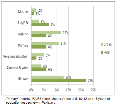 Universal access to basic education is the second Millennium Development Goal. Education is a vital prerequisite for empowering women. Inferential statistics utilized in this study concluded that out of the illiterate mothers (35%), most were in rural settings. According to the AJK Demographic Health Survey of 2010, 40% of the female population in AJK have no education17. Only 29% of girls of primary school age are actually in school; the proportion of boys is considerably higher, at 40%8.