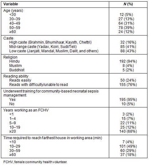 Table 1 shows the demographics and work experience of the 205 FCHVs examined in the study. Demographically, the FCHVs were of a mean age of 47 years and represented a range of predominantly plains ethnicities, primarily Hindu, Maithili-speaking. In terms of education, skills, and employment, nearly 75% were illiterate or barely literate, more than 90% had worked as FCHVs for more than 5 years, almost 70% had 20 years of work experience as FCHVs, and 53% could reach the farthest point in their assigned areas within 30 minutes by foot.