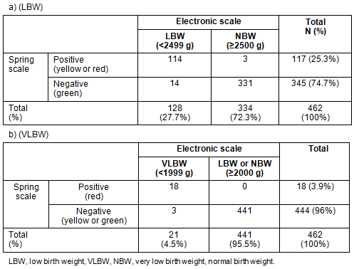 Table 2: Identification of low birth weight and very-low-birth-weight infants by electronic- and spring-scale measurement