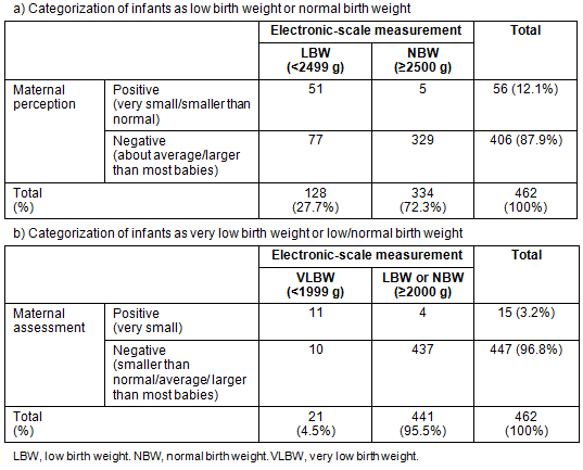 Table 3: Comparison of use of maternal assessment and electronic-scale measurement in infant weight categorization