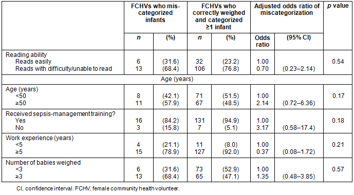 No statistically significant differences were found between the background characteristics of the FCHVs who had miscategorized infants and those who had not. Although the sample size was small, the results indicate that FCHV background variables, including age, literacy, training, and work experience, may not be very influential in determining how well FCHVs are able to conduct their tasks. However, when asked to describe the protocol, a greater percentage of the literate FCHVs correctly described the actions that they should take when they encountered with a high-risk infant. Thus, literacy may be important for program effectiveness and sustainability, and the FCHV system may benefit if a greater number of literate women are recruited.