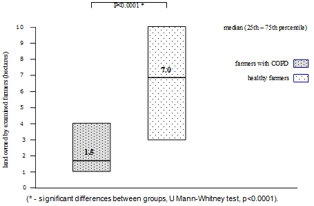 Methods: Thirty farmers with COPD and 34 healthy farmers from the Lublin region (Poland) were investigated based on the area of land they possessed (an indicator used in the health insurance system in Poland to classify farmers). The farmers from five rural communes were selected by general practitioners. Statistical analysis was performed by non-parametric Mann-Whitney U-test for the differences between area of farms. The p<0.05 level was considered as significant.