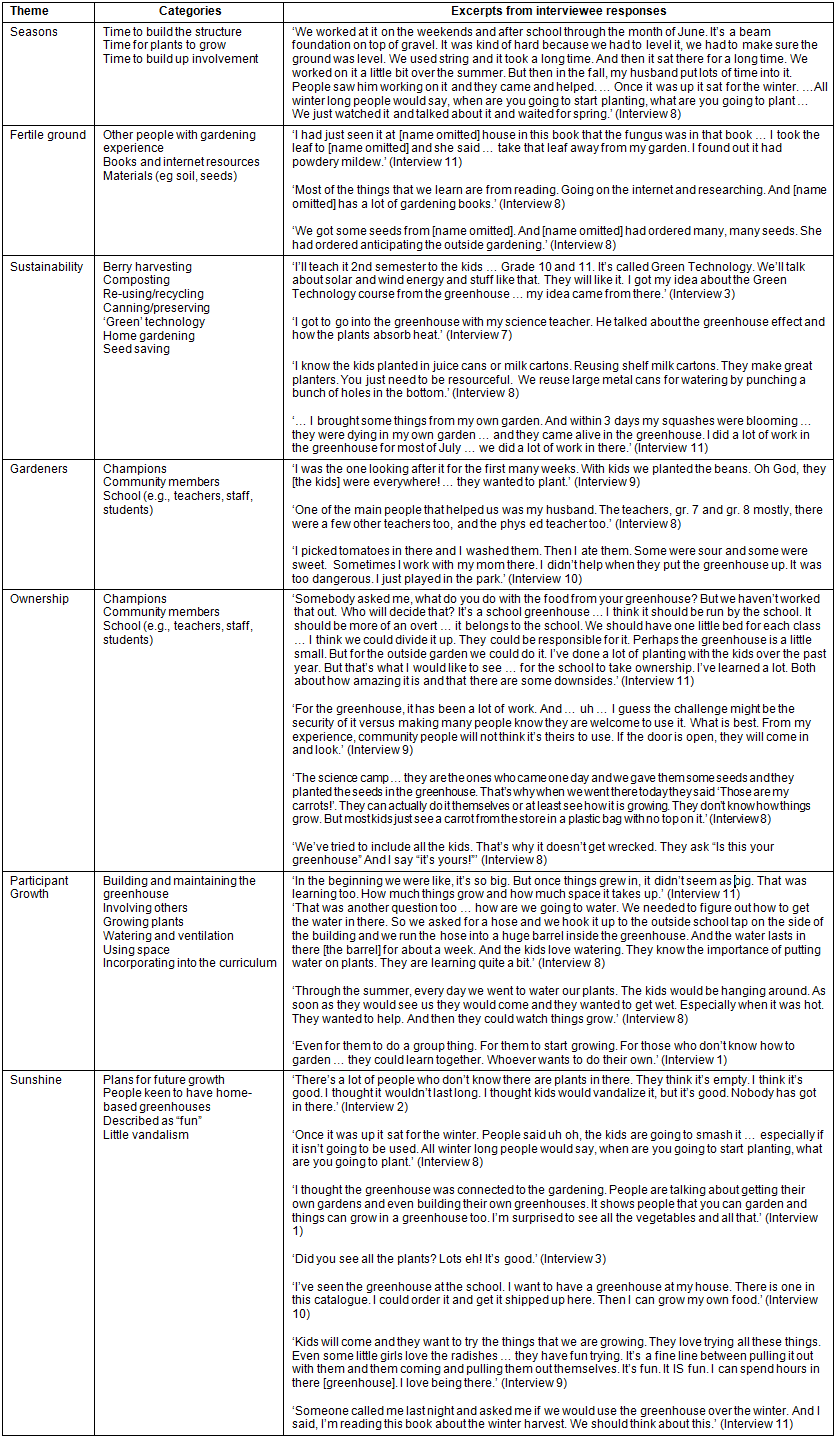 Interviews: In October 2011, after the greenhouse had been assembled and gardening activities had been established, semi-directed, informal interviews were conducted with adult and child key informants by a trained interviewer. Initially, adult participants (n=5) were purposively selected based on their connection to the greenhouse: community members who had been involved with either building the structure and the raised beds, planting seedlings and seeds, caring for the greenhouse and plants; and/or teachers who incorporated greenhouse activities into their classroom curriculum. Snowball sampling helped to identify nine more key informants. The interview schedule was flexible, open-ended and based around the theme of the greenhouse. Verbal consent was obtained from adults, and parental consent obtained for children. All interviews were conducted in English, although Cree interpreters were available to translate if they had been requested. Interviews were audiotaped with the consent of the interviewees. Interviews lasted from 15 to 95 minutes; shorter interviews were with children and the longest interviews with local champions leading the greenhouse initiative.