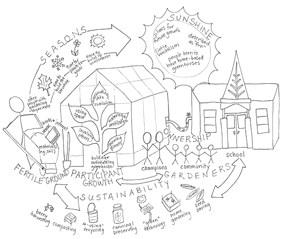 History and timeline: In February of 2009, university partners secured one-time seed funding from the Canadian Government for community-based initiatives to support healthy eating in FAFN youth. The distance between the university and FAFN is nearly 1000 km. The community advisory committee identified priorities and decided on a greenhouse. Indeed, this had been on their agenda for many years: the original plans for the new school, which opened in 2001, had included a school greenhouse. Unfortunately the greenhouse had been excluded from the final school building construction due to financial constraints. A timeline depicting the chronological process49,50 for this case study over a period of 33 months, from early 2009 until October of 2011, was developed (not shown). In particular, it identified milestones in the community development of the greenhouse, in researcher participation in the project, and a detailed way to describe the progress of the greenhouse from its inception.