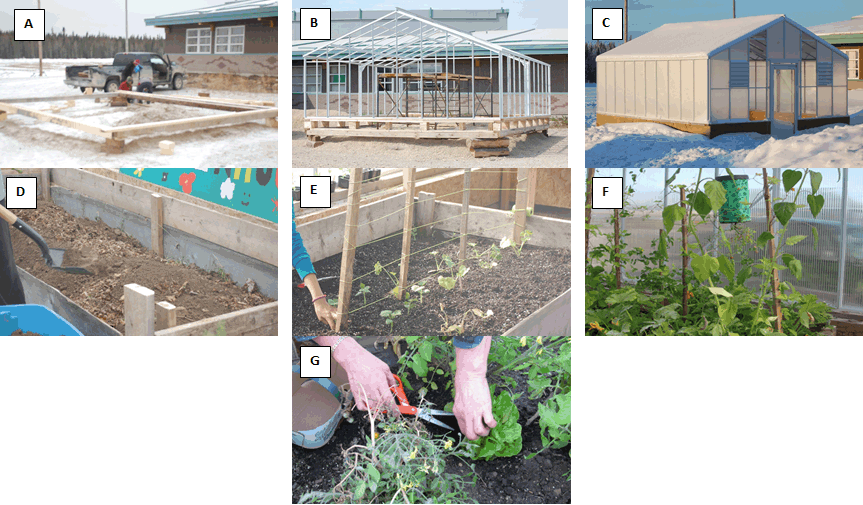Figure 2: From construction to harvest. (A) 21 November 2009: Following the arrival of the greenhouse pieces, a few teachers and community members began to construct the foundation for the greenhouse out of wood from the local sawmill. Community members felt it was important to have the foundation initiated and to let it sit over the winter and spring thaw to make sure that it would not shift through the seasons. (B) 16 June 2010: Greenhouse construction in progress during the following summer of 2010. (C) 11 January 2011: The greenhouse was built and sat under a blanket of snow, waiting for spring to arrive. (D) 25 June 2011: Inside the greenhouse, raised garden beds were built out of wood and filled with dirt. (E) 29 July 2011: A young girl helped to meticulously plant seeds in one of the raised beds in the greenhouse. (F) 2 October 2011: Vegetable plants, even sunflowers, thriving in one of the raised beds inside the greenhouse. Beans, peas, carrots, squash, tomatoes, various types of lettuce and a few flowers were planted and grown in the greenhouse. (G) 5 October 2011: Harvesting a head of lettuce to make a salad for dinner.