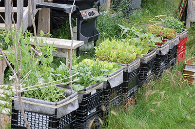 Figure 3: A crate garden, planted and maintained by a local and experienced gardening enthusiast. The owner of this garden was a great resource for gardening knowledge for the local project champions overseeing the greenhouse. (Photo taken 2 August 2011.)