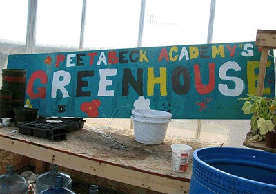 Figure 5: A colourful sign painted by literacy camp members for the greenhouse. The sign was painted in the summer of 2010. Peetabeck Academy is the name of the school situated next to the greenhouse. (Photo taken 1 October 2011.)