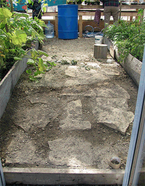 Figure 6: View at the entrance of the greenhouse. Stones from nearby were used to make a sturdy and appealing path through the center of the greenhouse. A tree stump served as a seat to be used while weeding and suckering tomatoes. Tables along the back wall held seedlings, flowers, and pitcher plants that had been retrieved during a student biology excursion. A large blue barrel was used to hold a large quantity of water for watering. (Photo taken 1 October 2011.)
