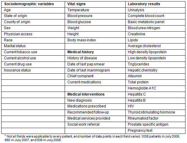 Data from each year were analyzed separately, and then compared and averaged across the 3-year period. Patients were excluded if they were electronically registered for the RAM clinic through the University of Virginia medical record system but did not receive any medical services. Duplicate patient encounters from the same year were consolidated into a single patient record. However, duplicate patients seen at RAM in different years were kept as separate patient encounters. In accordance with Institutional Review Board (IRB) regulations, each patient was assigned a unique study number to ensure patient anonymity. Since diabetes, hypertension, and obesity were three of the most prevalent diseases in the area, the data pertaining to these diseases from RAM 2008 were analyzed in-depth.