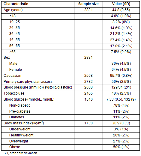 In 2008, 25.6% of blood glucose readings at RAM were greater than normal. According to the Mayo Clinic, in a random blood glucose test, values between 3.89 and 7.78 mmol/L (70 and 140 mg/dL) are considered normal, and a value greater than 11.11 mmol/L (200 mg/dL) suggests diabetes8. Of the patients seen, 3.7% of patients were diagnosed as new diabetics, and 19% of known diabetic patients required major adjustments to their medication to better control their blood sugar. Haemoglobin A1C (HbA1c) was used to quantify long-term diabetes management. The results in Figure 3 show that 52% of patients tested had a HbA1c level greater than 7%, indicating the patient is not managing his or her diabetes well8. The positive correlation between a random blood glucose test and high HbA1c values show that those with poorly managed diabetes presented with higher glucose levels. The variance in blood glucose levels and HbA1c values as shown by the red variance bars is also an indication of diabetes management. Those patients with well-controlled diabetes had less variance in their blood glucose and HbA1c values as compared to those with poorly controlled diabetes. Diabetic patients also had a high incidence of comorbidities: 71% of diabetic patients were also obese, and 64% reported having hypertension. Of the total sample, 74% of patients were either overweight or obese on average.