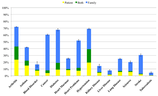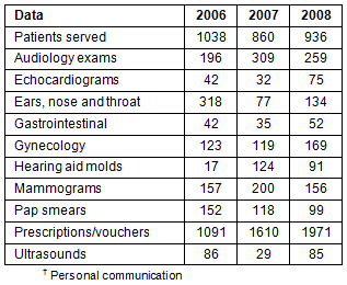 The data in Table 3 summarizes the types of services provided at RAM from 2006 to 2008, with a focus on medical services. Variation in number of reported services is due to variation in funding, resources, and volunteers available each year for the specific services. Patient and family histories were acquired for most patients (some charts were incomplete) seen in medical triage, and are shown in Figure 1. The most common ailments patients reported were arthritis, hypertension, asthma, diabetes, and heart problems. Patients were also asked to self-report their insurance status. Of the 727 patients who reported an insurance status in 2008, 62% were uninsured, 16% used Medicare, 14% used Medicaid, 7% had private or employer provided insurance, and 1% had veteran's benefits.