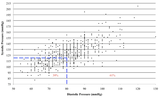Figure 2: Scatter plot of all blood pressure measurements at Remote Area Medical 2008 clinic